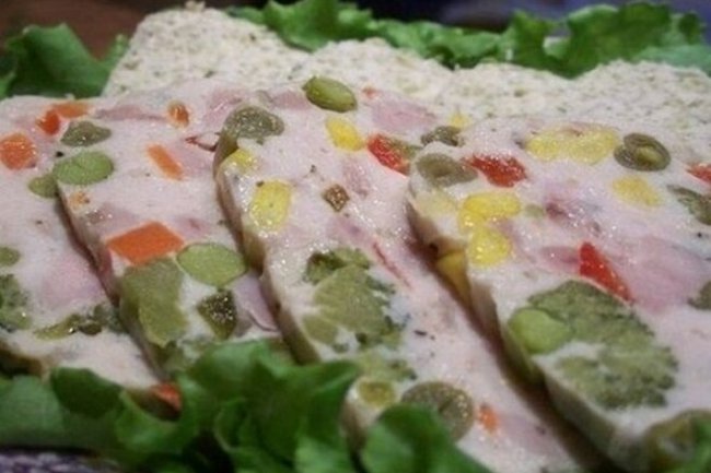 Закуску при подаче нарезать ломтиками, выложить на листья зеленого салата. Украсить блюдо помидорами черри, оливками, маслинами, зеленью, тонко нарезанным лимоном.