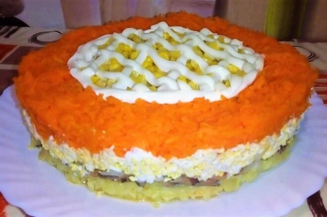 Затем отварная морковь так же тертая на мелкой терке, в центр выкладываю кукурузу. Отправляю на час в холодильник.