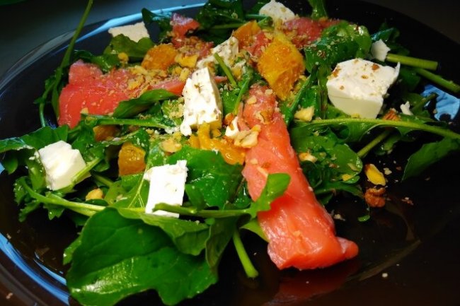 Салат с рукколой, семгой, апельсином и сыром фета - «Закуски»