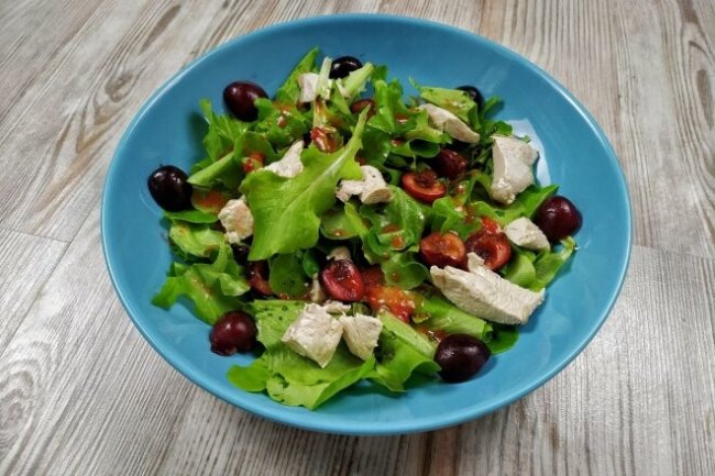 Салат с курицей и черешней под клубничной заправкой - «Закуски»