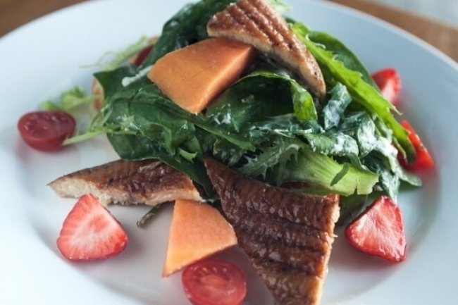 Ингредиенты: угорь копченый 90 г ---------------------- папайя 35 г ---------------------- помидоры черри 25 г ---------------------- клубника 20 г ---------------------- майонез 20 г ---------------------- шпинат 20 г ---------------------- салат фризе 10 г ---------------------- хрен 10 г ---------------------- соль 1 щепотка Приготовление: ШАГ 1 Смешать в тарелке травы — салат фриссе, листья шпината и сливочный хрен. Полить небольшим количеством майонеза, посолить по вкусу. Копченый угорь порезать порционными кусочками, придав форму треугольников. Также порезать папайю. ШАГ 2 Клубнику вымыть и нарезать дольками, помидоры черри разрезать пополам. На широкую тарелку выложить горкой зелень, сверху помидоры, кусочки папайи и дольки клубники. По бокам салата с папайей и клубникой разложить копченый угорь. Приятного Вам аппетита!
