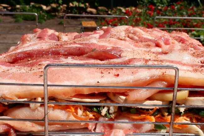 Ингредиенты: свиная грудинка 1 кг ---------------------- шампиньоны 5 шт. ---------------------- морковь 2 шт. ---------------------- сыр копченый 300 г ---------------------- куриное филе 2 шт. ---------------------- перец сладкий болгарский 1 шт. ---------------------- помидоры 2 шт. ---------------------- лук зеленый 30 г ---------------------- зелень укропа 30 г ---------------------- чеснок 6 зубчиков ---------------------- сметана 100 г ---------------------- перец острый ? ч.л. ---------------------- перец черный молотый 1 ч.л. ---------------------- соль 1.5 ч.л. Приготовление: ШАГ 1 Нарезаем свиную грудинку на полоски. ШАГ 2 Смешиваем соль, черный молотый перец и красный острый. ШАГ 3 Нарезаем куриное филе, отбиваем и посыпаем смесью соли и перцев. ШАГ 4 Натираем морковь, добавляем чеснок и сметану. ШАГ 5 Натираем копчёный сыр. ШАГ 6 Нарезаем овощи колечками. ШАГ 7 Нарезаем зелень. ШАГ 8 На решетку выкладываем свиную грудинку, куриное филе, морковь, зелень, сыр, шампиньоны, сладкий перец, помидоры и посыпаем каждый слой смесью соли и перцев. ШАГ 9 Накрываем всё это куриным филе и свиной грудинкой. ШАГ 10 Жарим на углях по 15 минут с каждой стороны. Приятного Вам аппетита!