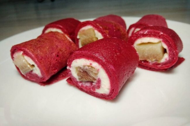 Ингредиенты: свекла 200 г ---------------------- мука 100 г ---------------------- яйца куриные 1 шт. ---------------------- сахар 1 ст.л. ---------------------- соль 1 ч.л. ---------------------- молоко 200 мл ---------------------- ряженка 50 мл ---------------------- сыр сливочный (пастообразный)200 г ---------------------- филе сельди 200 г ---------------------- масло растительное 1 ст.л. Приготовление: ШАГ 1 Свеклу измельчить погружным блендером. Добавить сахар, яйцо, соль, молоко и ряженку – перемешать. Всыпать муку и перемешать. ШАГ 2 Сковороду смазать растительным маслом и выпекаем блины. ШАГ 3 На край блина намазать сливочный сыр толстым слоем, выложить ряд кусочками сельди в 1 слой и завернуть в рулет. Нарезать на кусочки. Приятного Вам аппетита!