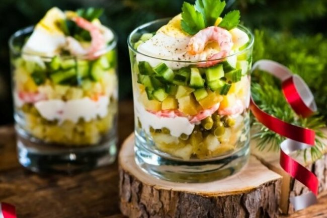 Ингредиенты: колбаса (ветчинная) 100 г ---------------------- креветки 100 г ---------------------- картофель в мундире 3 шт. ---------------------- зеленый горошек консервированный 100 г ---------------------- огурцы свежие 3 шт. ---------------------- яйца вареные 2 шт. ---------------------- огурцы соленые 3-4 шт. ---------------------- майонез Приготовление: ШАГ 1 В прозрачные широкие стаканы выложить слоями отваренный и нарезанный картофель, свежие и соленые огурцы, яйца, горошек, ветчинную колбасу, креветки, горошек. ШАГ 2 Слои заправлять майонезом. ШАГ 3 Сверху порции посыпать рублеными яйцами, украсить майонезом, половинками яиц, листочками петрушки, красной икрой. СОВЕТ Стаканы для новогоднего стола можно обвязать яркими бумажными ленточками, серпантином. Приятного Вам аппетита!