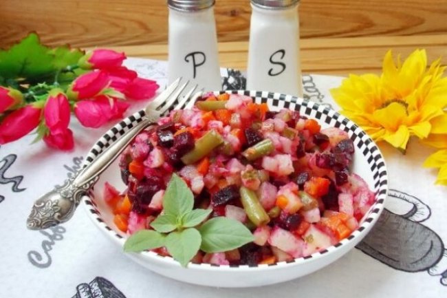 Ингредиенты: свекла 300 г ---------------------- спаржа 200 г ---------------------- картофель 150 г ---------------------- капуста квашеная 120 г ---------------------- морковь 100 г ---------------------- лук репчатый 50 г ---------------------- масло растительное 45 мл ---------------------- лимонный сок 18 мл ---------------------- масло кунжутное 16 мл ---------------------- горчица 8 г Приготовление: ШАГ 1 Свеклу, морковь и клубни картофеля отварить в кожуре. ШАГ 2 Очистить, нарезать овощи кусочками. ШАГ 3 Свеклу полить растительным маслом. ШАГ 4 Слить жидкость от квашеной капусты. ШАГ 5 Отварить спаржу в течение четырех минут. ШАГ 6 Переложить в сковороду, полить кунжутным маслом, спассеровать в течение двух минут. ШАГ 7 Продукты перемешать, добавить рубленый репчатый лук. ШАГ 8 Приготовить заливку из подсолнечного масла, лимонного сока, ингредиенты перемешать. ШАГ 9 Залить салат. СОВЕТ Готовый винегрет украсить зеленью. Приятного Вам аппетита!