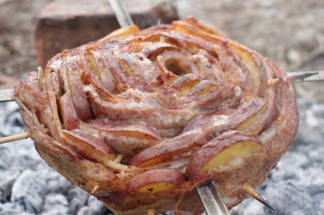 Ингредиенты: картофель 5 шт. ---------------------- свиная грудинка 500 г ---------------------- соль 1 ч.л. ---------------------- масло растительное 2 ст.л. ---------------------- перец черный молотый ? ч.л. ---------------------- паприка копченая ? ч.л. Приготовление: ШАГ 1 Смешиваем соль,черный молотый перец и копченую паприку. ШАГ 2 Нарезаем картофель на кружочки. ШАГ 3 Свиную грудинку нарезаем полосочками. ШАГ 4 Посыпаем картофель и свиную грудинку смесью соли и перцев. ШАГ 5 Сворачиваем, чередуя свиную грудинку и картофель. ШАГ 6 Поливаем растительным маслом и заворачиваем в пергаментную бумагу и фольгу. ШАГ 7 Жарим на углях 35-45 минут. ШАГ 8 Снимаем фольгу и поджариваем на углях до румяной корочки. Приятного Вам аппетита!