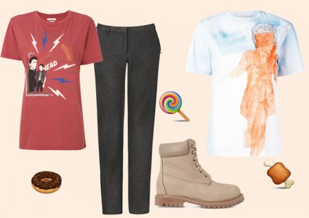 Самый очевидный вариант для любителей основательно подкрепиться — треники и юбки на резинке. Тут можно хоть целого гуся проглотить, никто не заметит. При желании нетрудно даже придумать вполне себе выходной, но вместе с тем комфортный образ с такими штанами. Тебе понадобится футболка с красивым принтом, высокие ботинки на шнуровке, ну и их величество треники на резинке.