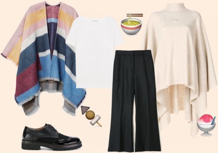 Пончо в сочетании с брюками или юбкой из стрейчевой ткани — отличный вариант для непродолжительной прогулки. Ни одна живая душа не узнает, сколько бутербродов вы разогрели прошедшей ночью.