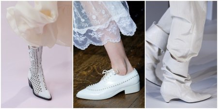 Chloe; Simone Rocha; Stella McCartney.Обувь белого цвета вошла в моду еще прошлой весной: так что, если ты уже купила пару лодочек или перчаточных туфель, порадуйся своей расторопности. Не будем ходить вокруг да около: белоснежную обувь (будь то хоть кроссовки, хоть дерби) практически невозможно носить в холодное время года. Лучше запастись терпением и дождаться хотя бы мая. Кроме того, самый популярный прием, подсмотренный на мировых подиумах — белый тотал-лук. У Simone Rocha — воздушные юбки из кружева и тюля, у Stella McCartney — брюки, а у Chloe — белоснежные платья из шелка.