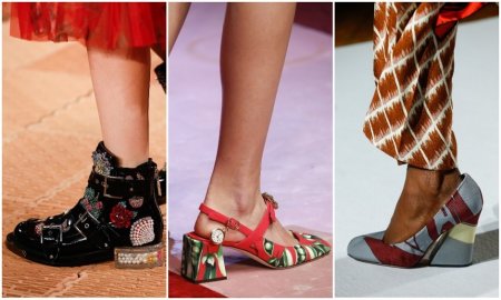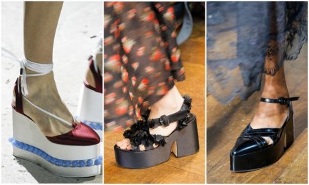 Mary Katrantzou; Simone Rocha; Simone Rocha.Туфли, отдаленно напоминающие японские поккури и массивную обувь из 1990-х, имеют все шансы завоевать наши сердца в 2018 году. Тут есть и закрытые модели из кожи, и более легкомысленные текстильные сабо. В любом случае в таких точно удобнее, чем на каблуках, а выглядят они очень нарядно. Кстати, вечной спутницы платформы, танкетки, в этом сезоне как-то не наблюдается, так что прибереги ее до лучших времен.