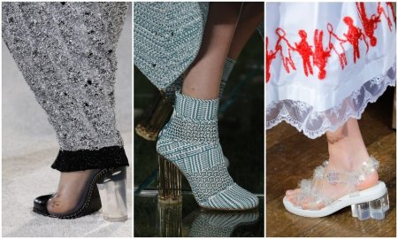 Balmain; Salvatore Ferragamo; Simone Rocha.Если с формой в этом сезоне решило поэкспериментировать очень небольшое количество брендов, то каблуки, напоминающие крупные ледышки, встречались на каждом втором показе. Высота, ширина и форма — самые разные. Особенно красивый вариант был у Simone Rocha: прозрачные каблуки в форме цветов.