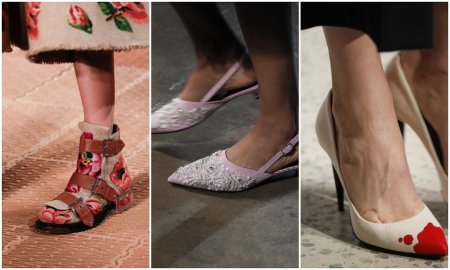 Alexander McQueen; Erdem; Oscar de la Renta.Если твоя единственная текстильная пара в летний сезон —– эспадрильи или кеды, то пора срочно исправлять положение. Шелк, лен, хлопок, жаккард и твид могут составить неплохую коллекцию. Обязательно обрати внимание на лодочки с контрастным носом, вроде пары с показа Oscar de la Renta. Кровавые пятна — смелый ход, но в новых коллекциях будут и менее агрессивные варианты.
