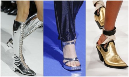 Christian Dior; Gucci; Maison Margiela.Обувь из металлизированной кожи — самая универсальная отсылка к стилю футуризм. Если топы-кольчуги или платья из струящегося серебряного ламе рискнет надеть не каждая девушка, то обувь и аксессуары отлично подойдут даже к самому строгому черному платью.