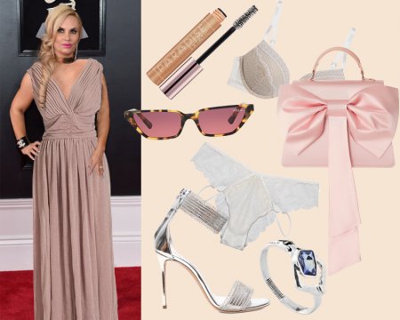 Слева: платье, Twinset; очки, Dolce&Gabbana; джинсовка, Wrangler; сумка, Springfield; босоножки, Twinset. Справа: серьги, Mango; водолазка, Marie by Marie; сумка, Burberry; брюки, Mango; мюли, 19.04.Предлагаем переодеть актрису в платье в мелкий узор с босоножками на платформе и сумкой-ведерком. Женственно и не слишком вычурно, по сравнению с другими гостями (уж Николаса Кейджа никто не переплюнет).