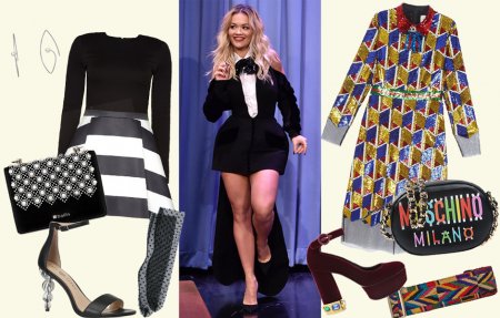 Водолазка, Marie by Marie; брюки, Mango; серьги, Mango; палетка теней, NYX Professional Makeup; сухой кондиционер для волос, Sephora; сумка, Burberry; мюли, 19.04.Теперь — к новой проблеме — образу пингвина от Риты Оры на телевизионном шоу с Джимми Фэллоном. К экстравагантным нарядам певицы мы в целом привыкли. Но в этом виде она напоминает соседского мальчика из детского сада, нарядившегося пингвинчиком зайчиком на Новый год.