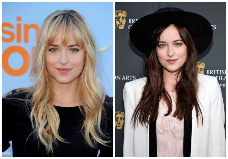 Слева 2012 год. Справа 2013 годНе зря ведь говорят, что, изменив цвет волос, можно поменять жизнь. Мало кто знает, но светленькая Дакота стала брюнеткой только в 2013 году, после того как ее утвердили на роль Анастейши Стил. И как же ей идет эта перемена! Впервые она появилась с новым цветом на красной дорожке BAFTA в Лос-Анджелесе. На ней — белый пиджак, черные брюки и нюдовая блуза в тон лодочкам, а дополняет наряд широкополая черная шляпа. С тех пор актриса так и не вернулась к натуральному оттенку волос, оставив роковую нотку в своем образе.