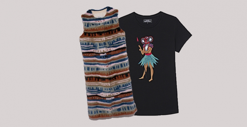 Жилет Yves Salomon; футболка Катя DobrяkovaЭтой весной дизайнеры радуют нас настоящими произведениями искусства на мехе. Можно встретить модели с аппликациями и даже целыми картинами. В моде массивные наклейки с героями комиксов.