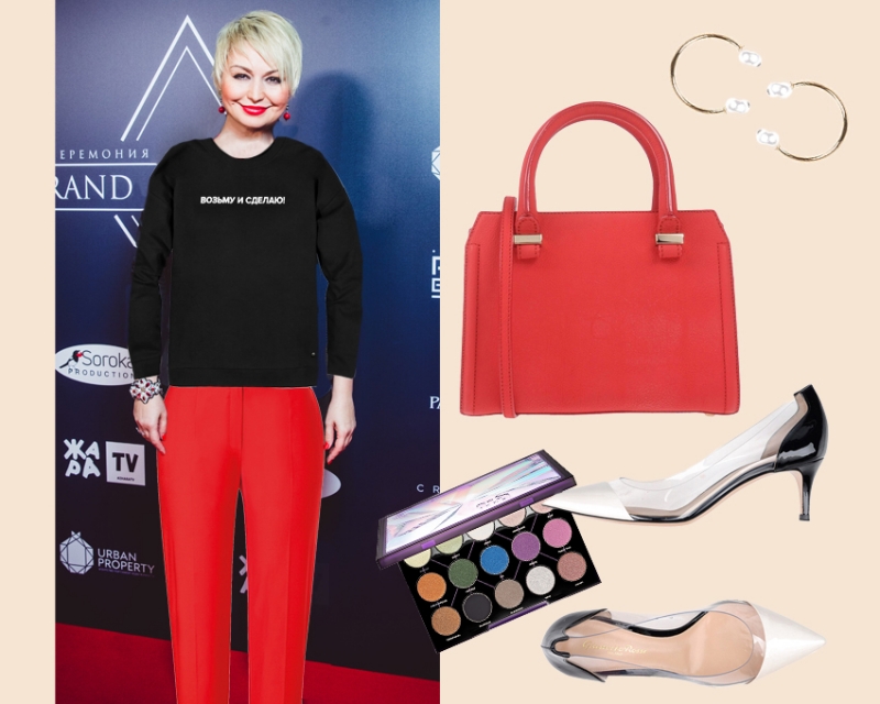 Свитшот TOM TAILOR; брюки Escada; сумка VITORIA BECKHAM (yoox.com); серьги Uterque; туфли Gianvito Rossi (yoox.com); тени Urban Decay.Российской знаменитости к лицу красные брюки и надпись на кириллице «Возьму и сделаю» — может быть, теперь новую песню запишет?