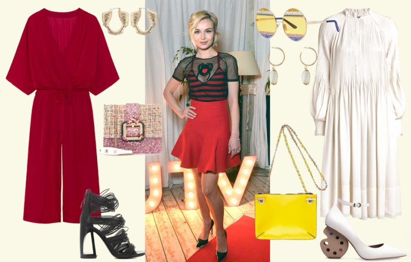 Второй — бело-желтое сочетание платья, сумки и очков. Туфли с палитрой красок намекают на артистичность натуры. Правда, мы бы на ней цвета поярче сделали.