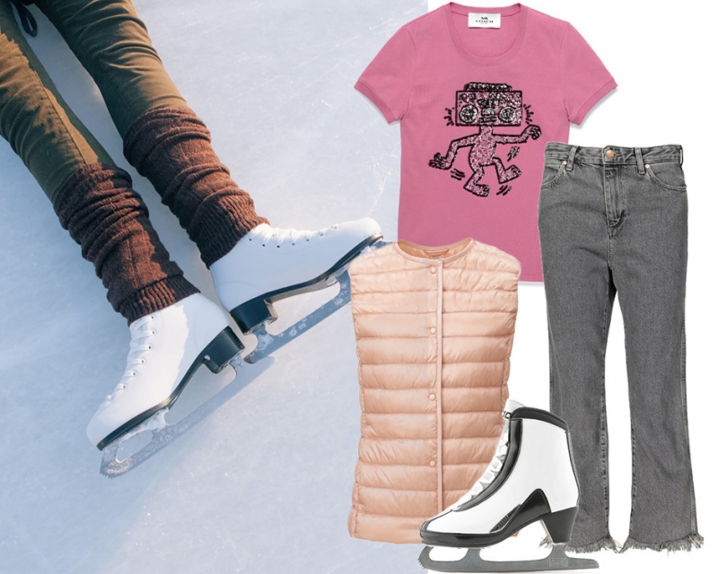Футболка Coach x Keith Haring; джинсы Wrangler; жилет Uniqlo; коньки Roces Stile (Спортмастер)Удиви своих друзей предложением отправиться не в бар, а на ночной каток с настоящим льдом. Круглый год на катке «Морозово» поддерживается одинаковая температура, чтобы держался лед, но ты не слишком мерзла. Покататься можно в ночь с субботы на воскресенье, там устраиваются массовые веселые заезды с музыкой, танцами и светскими фотографами.