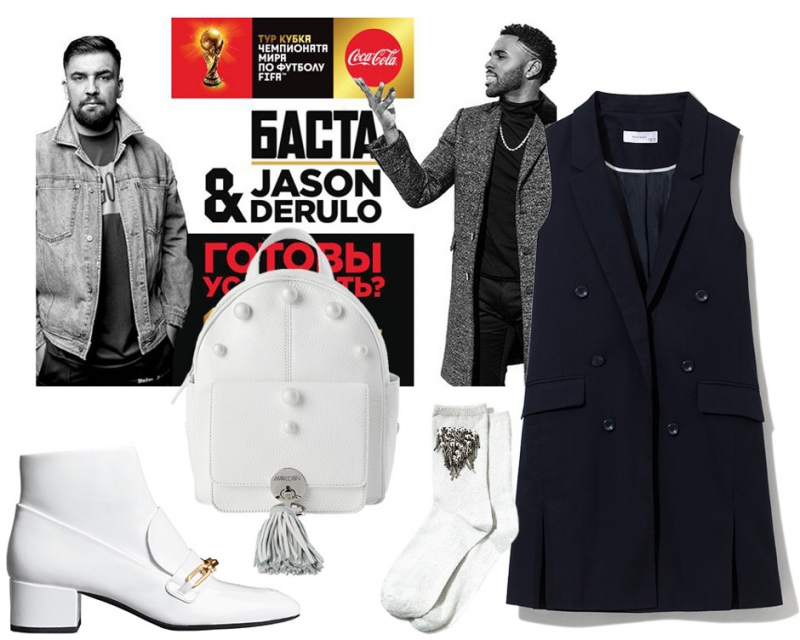 Платье-жилет Reserved; рюкзак Marc Cain; ботильоны Burberry; носки ReservedЧто объединяет этих двух исполнителей? А то, что оба они поют гимн Coca-Cola к предстоящему чемпионату мира по футболу FIFA 2018, только Баста — на русском, а Джейсон – на английском.