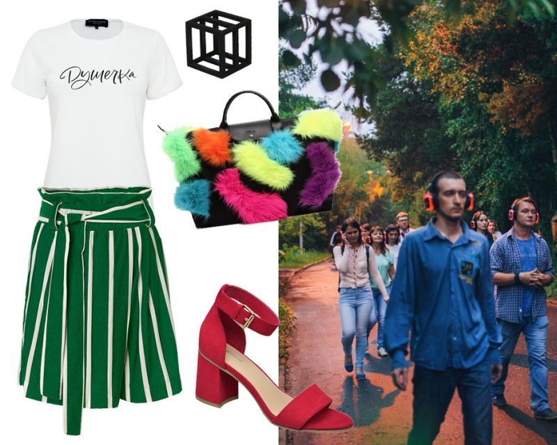 Футболка с симпатичной надписью, ярка юбка-шорты и еще более броская сумка с нестандартным украшением не дадут тебе затеряться в толпе таких же страждущих разгадать загадку молодой пары.