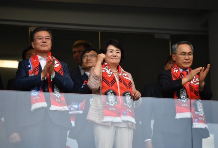 Президент Республики Корея присутствовал на матче между Южной Кореей и Мексикой в Ростове-на-Дону, там он был замечен в темно-синем костюме с фанатской «розой» на плечах.