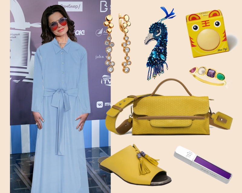 Теперь она красуется в светло-голубом платье с поясом, подчеркивающем стройную талию и с желтыми аксессуарами (оттенок — то, что надо: не слишком крикливый и вычурный, но и не мертвецки бледный). А бьюти-эксперты дали ей в руки бальзам для губ в смешной коробочке, спрей, фиксирующий макияж (чтобы он не расплавился под солнцем — ЖАРА же), ну и средство с SPF — мы не устанем напоминать, что, даже если ты на улицу высунула только нос, нужно его намазать солнцезащитным кремом. Заглядение!
