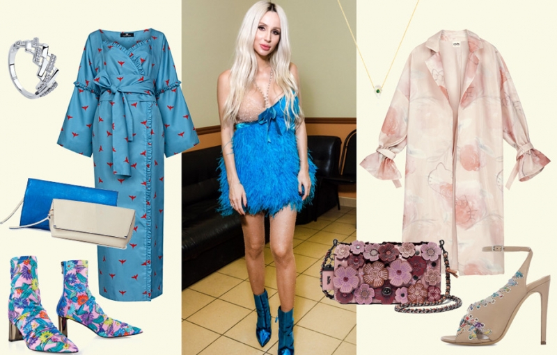 Слева: платье Kochetkova; кольцо Sokolov; клатчи Angona; ботильоны Marc Cain. Справа: кимоно Hello Kitty x ASOS; ожерелье Tous; сумка Coach; босоножки BallinПервый — голубое платье с подчеркнутым лифом, фантазийные яркие ботильоны (все-таки Лобода любит быть заметной), чтобы раз и навсегда научиться сочетать принты, ну и немного спокойных аксессуаров.