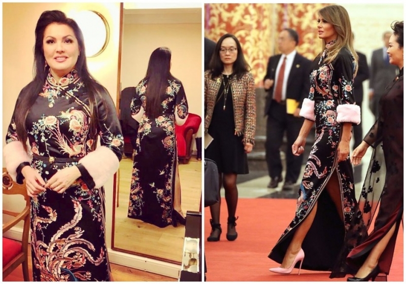 Эти девушки засветились в платье-кимоно с розовым мехом от Gucci. Мелания надела его во время визита в Китай, а Анна получила наряд в подарок от мужа — и тут же примерила его в своей гримерке.