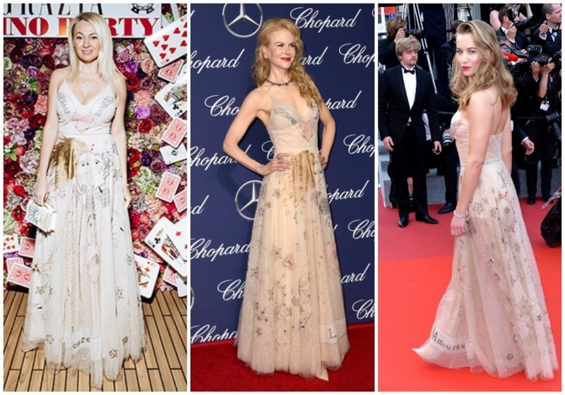 Нежное платье Dior буквально оторвали с руками: сразу 3 мировых величины выбрали его для своих выходов. Яна Рудковская пришла в нем на вечеринку журнала Grazia, с собой она захватила фантазийный клатч. Светлана Устинова прошлась по красной дорожке Каннского кинофестиваля на премьере фильма «Нелюбовь» (кстати, кроме нее в том же платье и на той же дорожке потопталась модель Тилан Блондо). А Николь Кидман же позировала в платье на Международном кинофестивале в Палм-Спрингс: ее образ состоял из насыщенной красной помады, бежевых лодочек и ожерелья с сиреневыми камнями.