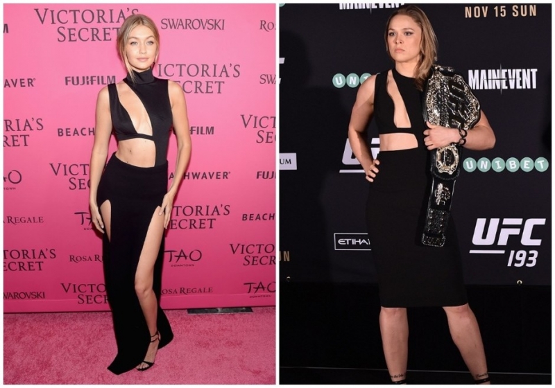 А это уже запрещенный приемчик! Девушки находятся явно в разных весовых и стилевых категориях, тем не менее обе надели асимметричное и откровенное боди бренда House of CB. Модель, любимица мировых дизайнеров Джиджи Хадид надела юбку с огромными разрезами, а рестлерша Ронда Роузи добавила пикантности наряду поясом победителя и юбкой-карандаш.