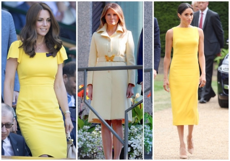 А буквально на днях в желтом (как тройняшки) появились в совершенно разных местах Меган Маркл, Кейт Миддлтон и Мелания Трамп — дамы, как сговорились. Меган выбрала платье-футляр от Brandon Maxwell (стоимостью в 1500 долларов) на встречу с представителями стран Содружества. Кейт появилась на мужском финале Уимблдона в платье с оборками на рукавах от Dolce & Gabbana (1300 долларов). А Мелания Трамп оказалась в светло-желтом платье-пальто с поясом-бабочкой от Gucci на исторической встрече президентов России и США в Хельсинки, ее наряд стоил дороже, чем у обеих герцогинь — 3700 долларов.