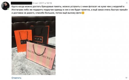 «Фирменные пакеты поднимут продажи и престиж вашей компании! Фирменная упаковка — как статус и стиль».Продажи здесь начинаются только от трех тысяч рублей, так что брать придется минимум десяток, если не больше. Есть даже пункт самовывоза на известном рынке «Садовод». Среди клиентов таких больших продавцов можно найти другие магазины, которые, например, продают фейковую косметику и одежду с AliExpress. Здесь они покупают наклейки, коробки и пакеты для своих товаров, как раз чтобы «поднять продажи и престиж» своей компании. Так что знай, фирменный пакет — вовсе не гарантия подлинности!