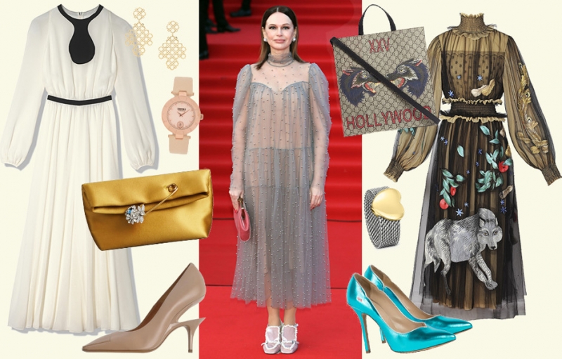 Слева: платье Longch серьги ZOE & MORGAN (Yoox.com); часы VERSUS VERSACE (Yoox.com); клатч BURBERRY (farfetch.com); туфли MAISON MARGIELA (Yoox.com). Справа: платье Alena Akhmadullina; сумка Gucci (selfridges.com); кольцо Tous; туфли Polina MagiyПервым вариантом мы постарались отразить желание Ирины надеть что-то воздушно-прозрачное и поэкспериментировать с квадратными носами у туфель — вуаля, и наша импровизация на тему «голого» и средневекового готова.
