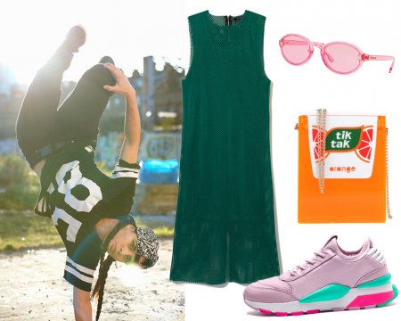 Одеваться, как r’n’b дива не стоит, лучше надень конфетного цвета кроссовки с модным платьем в сетку — возможно, принц с белым микрофоном заметит именно тебя.