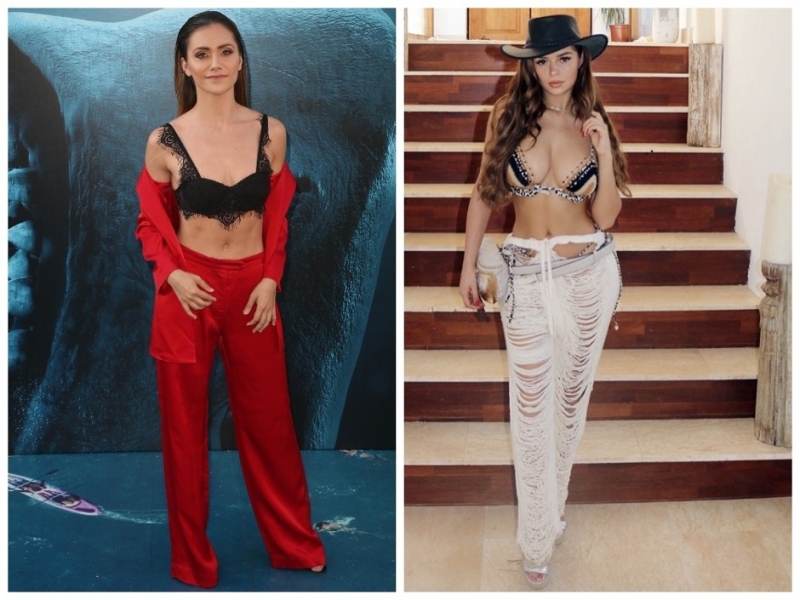 Элисон Стоунер на премьере фильма «Мег: монстр глубины» (слева) и Деми Роуз (справа) на фото из InstagramБолее скромная парочка звезд прячет белье под ажурными топами. Но и этот вариант сложно назвать успешным. Модель Лидия Херст смешивает кожаный жакет (вот еще одна мечта БДСМ-щика) с красным бралеттом (под него почему-то надет черный лиф) и желтыми брюками и получает суп из всех цветов радуги и текстур.