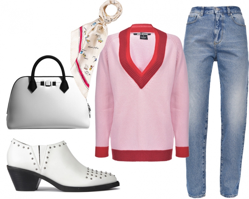 Гулять по самым красивым станциям подземки за руку с поклонником предлагаем в джинсах прямого кроя — беспроигрышный вариант для новой фигуры Елены, — ковбойских полуботинках остромодного белого цвета, в уютном свитере и шейном платке (кстати, повязать его можно и на запястье, и на ручку сумки, и на голову, и на шею — под настроение).