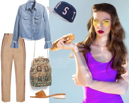 Для поедания хот-догов мы выбрали наряд в американском стиле: джинсовая рубашка, бейсболка и бежевые брюки.