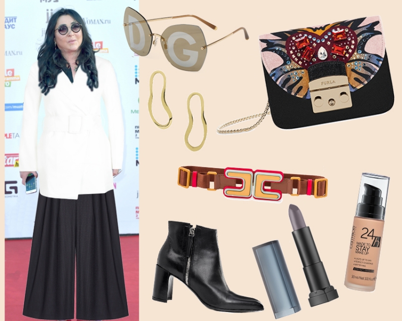 Брюки ЛИ-ЛУ; очки Dolce & Gabbana; удлиненный жакет Boohoo; сумка FURLA; ботильоны Premiata; серьги NINA KASTENS (yoox.com); пояс ELISABETTA FRANCHI; помада Maybelline; тональное средство Catrice