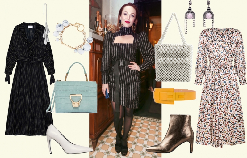 Второй — более яркое платье с доминирующим принтом и (отдельно) поясом, чтобы потешить желание Альбины утянуть талию. А за наполненность образа аксессуарами отвечают асимметричные серьги и сумка-хит сезона из «массажных» шариков (прямиком из 90-х).