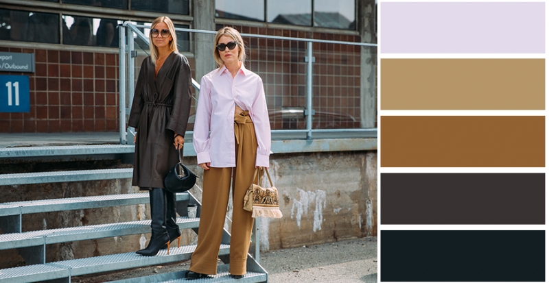 Бежевый, коричневый и черный — это три кита спокойного, достойного, осеннего образа. В палитре мы совместили цвета нарядов обеих девушек, потому что они настолько подошли друг другу по оттенкам, что их вполне можно «слить» в сиамских близняшек. Заметь, всю меланхолию нейтральных цветов разбавляет нежно-розовая рубашка — намотай на ус и попробуй применить в обычной жизни.