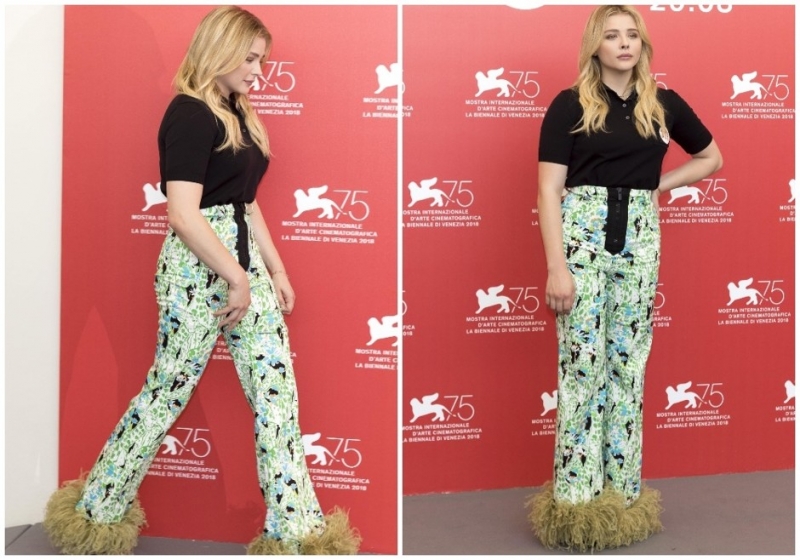 На фотоколл к фильму «Суспирия» Хлоя решила надеть брюки с перьями из круизной коллекции Miu Miu, футболку-поло (под цвет ширинки брюк) и босоножки. Образ составлен так, как будто девушка надела то, что выпало на нее из шкафа в темноте, а низ брюк напоминает карманных собачек, которых в нулевые it-girls носили в маленьких сумочках.