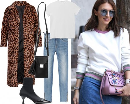 Надевай джинсы с белой футболкой, но дополни их леопардовым пальто и наносумочкой — Татьяна такой наряд одобрит.