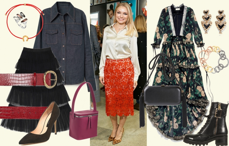 Первый — немного эклектичный (что и требовалось по условиям задачки): полупрозрачная юбка с оборками, джинсовая рубашка (для намека на ковбойский стиль), контрастный ремень, сумка, лодочки и украшения.