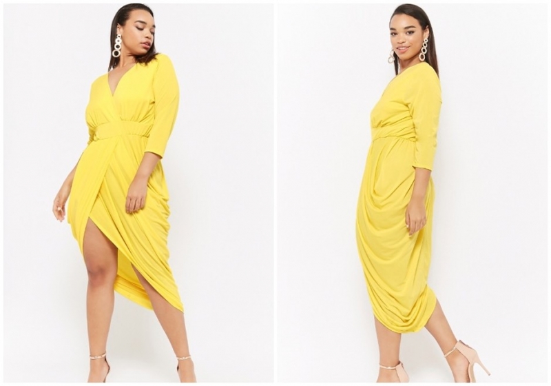Американцы все-таки знают толк в женском теле и в том, как превратить его в объект обожания и поклонения. Это сексуальное ярко-желтое платье с драпировкой в районе бедер заменит спортзал и поход на антицеллюлитный массаж: руки (часто проблемные места) прикрыты, грудь подчеркнута V-образным вырезом, разрез не слишком вульгарен, драпировка скрывает все неровности — любая женщина в нем будет идеальна.