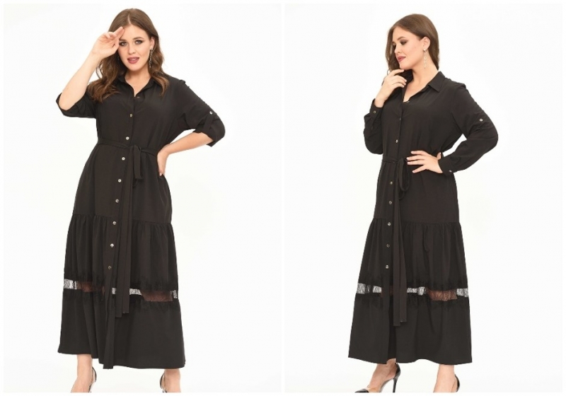 Платье-рубашка — всегда отличная идея, особенно, когда на нем есть интересная деталь, превращающая его из обычного предмета одежды в наряд. Кружевная полупрозрачная полоса чуть ниже колен придаст пикантности образу, не обнажив ничего лишнего.