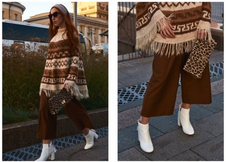 Этника всегда в моде. Почему бы и тебе не попробовать этот стиль? Достаем бабулин платок/пончо и комбинируем с ультрамодной белой обувью. Только тут есть одно правило: не больше одной вещи в этническом стиле в образе, иначе сольешься с аудиторией танцплощадки в Сокольниках, где всем сильно за 50.