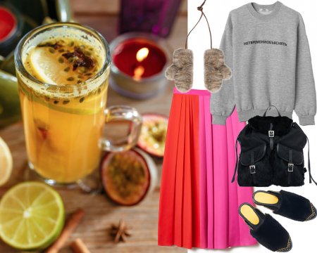 Юбка H&M; рюкзак PRADA (aizel.ru); тапочки Gutseriev & Maximova; варежки Dreamfur; толстовка BershkaДомашний уют стремительно перебирается в рестораны, так что сидеть под пледом, слушать хруст камина и пить какао с маршмеллоу — новое валяние на диване. В Soho Country Club предлагают иммунные бустеры — любой чай из собрания, глинтвейны и какао.