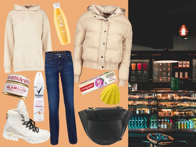 Укороченный пуховик и худи Boohoo, джинсы GUESS, кроссовки Premiata, сумка Wandler, паста Colgate, маска для лица Glamglow, бомба для душа Lush, дезодорант RexonaИдем гулять! Главное — одеться тепло и удобно. Рассказываем, куда заглянуть кроме катков, кино и парков: